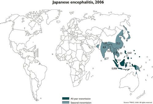 Filipinene, Kina, Korea, Japan, Taiwan og Thailand gir vaksine mot japansk encefalitt i barnevaksinasjonsprogrammet, og det kan gjøre at risikoen er strre for uvaksinerte turister enn den som fremgår av kartet."